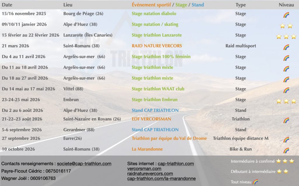 Nos stages CAP TRIATHLON vous offrent l’opportunité de progresser toute l’année avec des stages triathlon adaptés à tous les niveaux. Profitez de notre expérience pour atteindre vos objectifs avec des stages comme le stage natation/skating, le stage triathlon à Lanzarote, le stage triathlon 100% féminin, et bien d’autres encore. Rejoignez-nous pour améliorer vos performances et vous préparer pour vos compétitions triathlon, dans des lieux exceptionnels et avec un suivi personnalisé. Rejoignez-nous pour progresser, quel que soit votre niveau, et atteindre de nouveaux sommets !